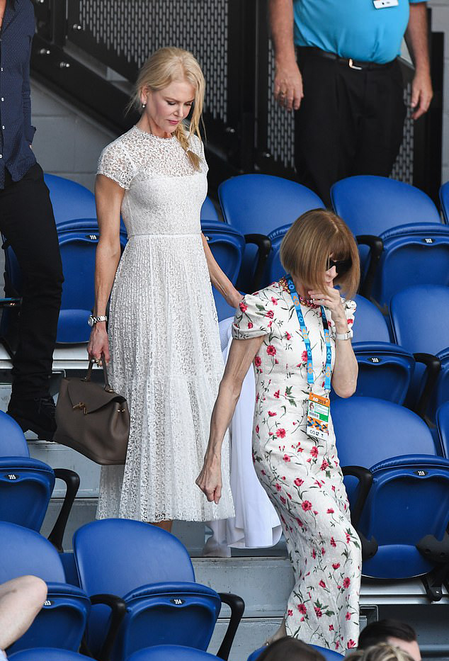 ყვავილებით დაპრინტულ თეთრ კაბაზე გააკეთა აქცენტი ანა ვინტურმაც, რომელიც კიდმანთან და ურბანთან ერთად ვიპლოჟიდან ადევნებდა თვალს ღია პირველობის დაძაბულ მატჩს.