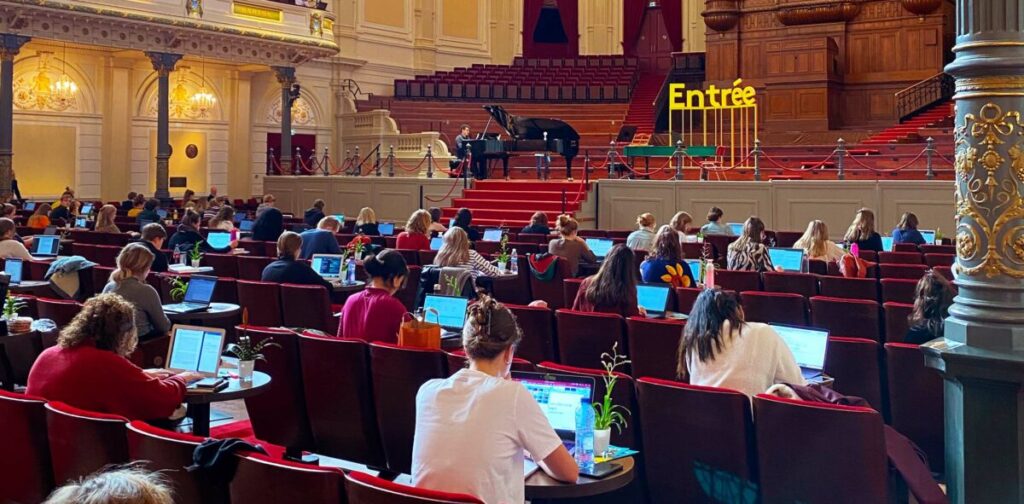 ამსტერდამში სტუდენტებმა გამოცდებისთვის მზადების უჩვეულო გზა იპოვეს – ისინი სწავლობენ არა სახლში, არამედ ისტორიულ საკონცერტო დარბაზში, სადაც მათთვის მუსიკას ნიდერლანდების სამეფო ორკესტრის მუსიკოსები ცოცხლად ასრულებენ.