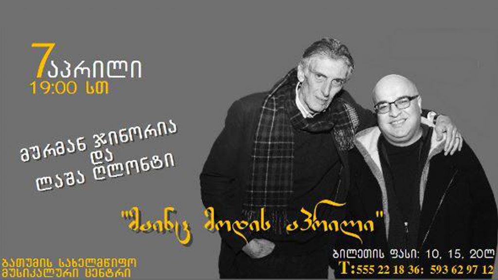 სიახლეები ბათუმში მურმან ჯინორიასა და ლაშა ღლონტის ერთობლივი საღამო გაიმართება 6 მარტი, 2019 7 აპრილს, 19;00 საათზე, ბათუმის ხელოვნების ცენტრში, მურმან ჯინორიასა და ლაშა ღლონტის ერთობლივი საღამო გაიმართება