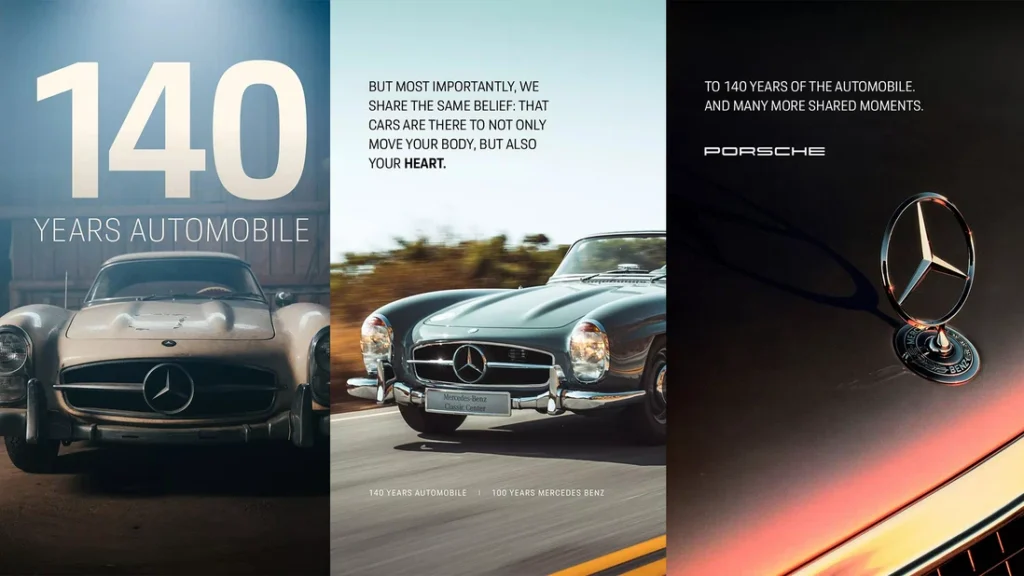 Porsche-მ იუბილესთან დაკავშირებით უფრო პატივისცემით სავსე ტონი აირჩია და Mercedes-Benz-თან საერთო მემკვიდრეობა, ერთობლივი პროექტები, ავტოსპორტის ისტორია და საინჟინრო პარტნიორობა გაიხსენა.