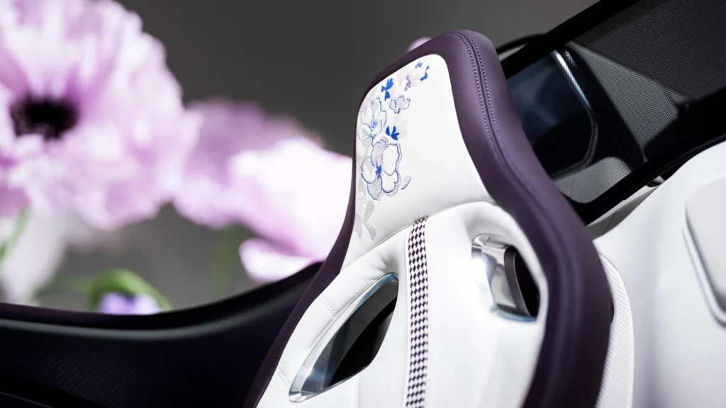 ინტერიერი გაფორმებულია თეთრი და მუქი იასამნისფერი ფერების კომბინაციაში. იგივე ყვავილოვანი ელემენტები გამოყენებულია სალონშიც – მაგალითად, ნაქარგები განთავსებულია თავსაფრებზე და კარის პანელებზე, სადაც ისინი ისეა შესრულებული, თითქოს ქარი ფურცლებს აფრიალებს.