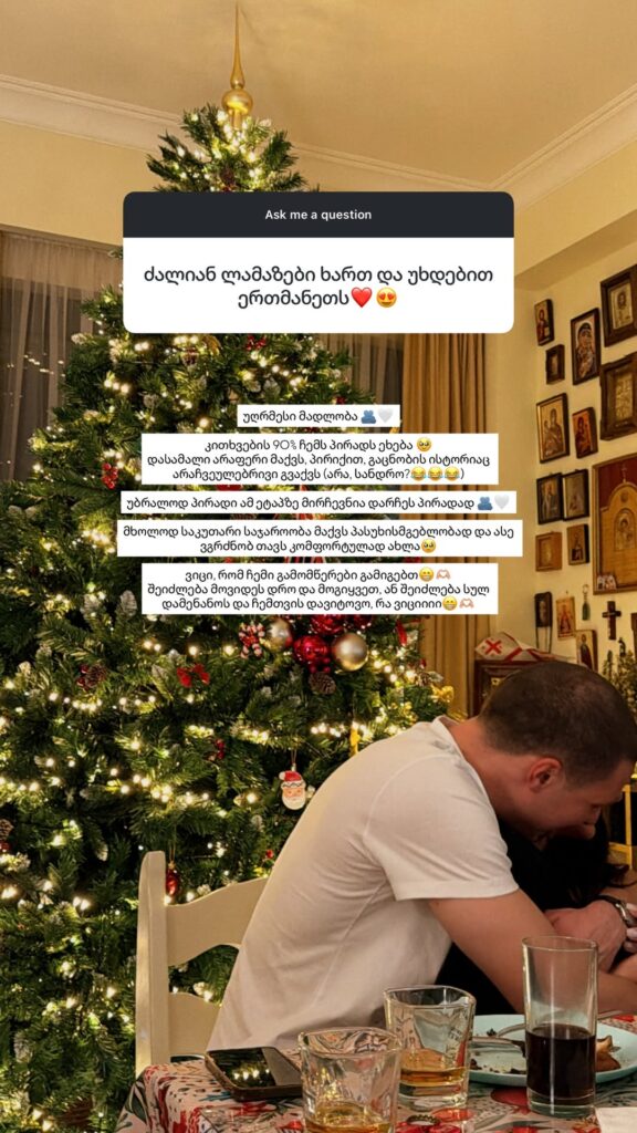 „უღრმესი მადლობა. კითხვების 90% ჩემს პირადს ეხება. დასამალი არაფერი მაქვს. პირიქით, გაცნობის ისტორიაც არაჩვეულებრივი გვაქვს, (არა, სანდრო?)