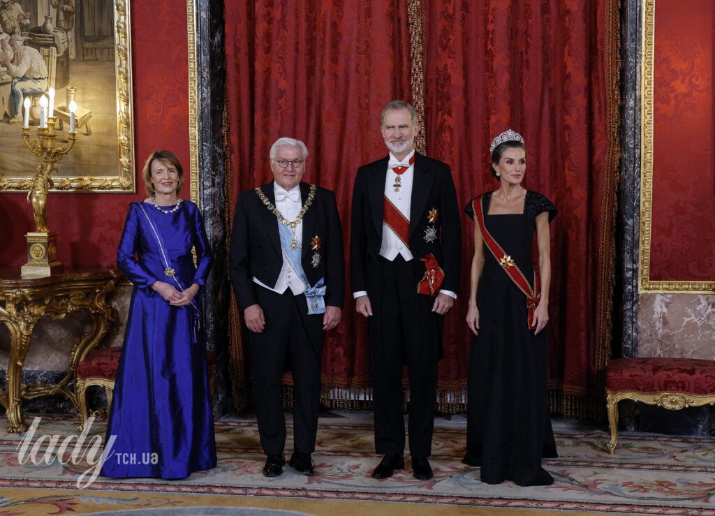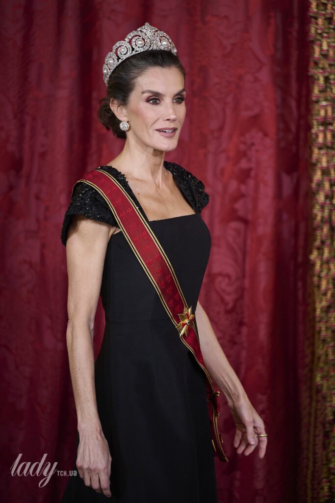 დედოფალი ლეტიცია ბანკეტზე შავი, გრძელი ელეგანტური კაბით გამოჩნდა, რომელიც „კაროლინ ჰერერამ“ შექმნა. ცენტრალურ ნაწილს კვადრატული დეკოლტე და მბზინავი შავი ქვებით მორთული მოკლე სახელოები წარმოადგენდა. მისმა უდიდებულესობამ საღამოს ლუქი ბრილიანტებით დამზადებული „კარტიეს“ დიადემით და ბრილიანტის საყურეებით დაასრულა.