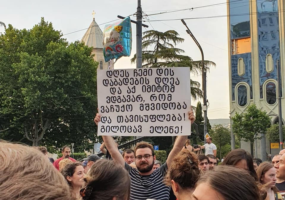 დღეს ჩემი დის დაბადების დღეა და აქ იმიტომ ვდგავარ, რომ ვაჩუქო მშვიდობა და თავისუფლება ! გილოცავ ელენე! – ამ წარწერით ბანერი, დღევანდელ აქციაზე ერთ-ერთ მოქალაქეს ჰქონდა მიტანილი. ბანერთან ერთად მას სადღესასწაულო ბუშტიც ეჭირა.
