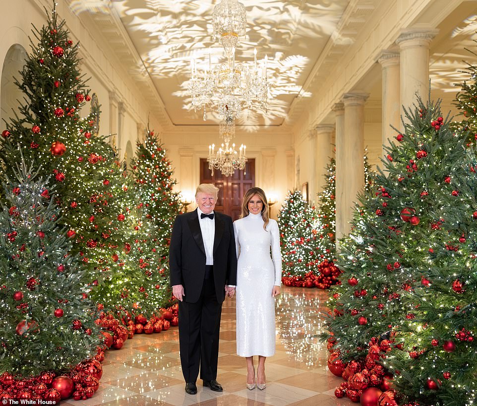 თეთრ სახლში საშობაოდ მორთულ Cross Hall-ში გადაღებულ ფოტოში დონალდი და მელანია ხელჩაკიდებულები არიან.