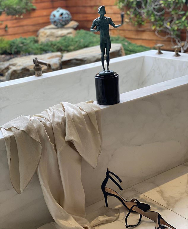 ფოტოზე ჩანს ენისტონის სააბაზანო ოთახი, SAG Awards-ის ქანდაკება და „დიორის“ ვინტაჟური კაბა, ასევე ფეხსაცმელი, რომელიც ენისტონს დაჯილდოვებაზე ეცვა.
