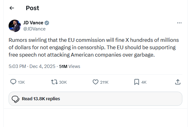 აშშ-ის ვიცე-პრეზიდენტმა ჯეი დი ვანსმა ბრიუსელი ამერიკულ კომპანიებზე „უსაფუძვლო თავდასხმაში“დაადანაშაულა. გადაწყვეტილების გამოცხადებამდე მან X-ში დაწერა, რომ პლატფორმა ისჯება იმის გამო, რომ „ცენზურით არ არის დაკავებული“. „ევროკავშირმა უნდა დაიცვას სიტყვის თავისუფლება და არა – დაესხას თავს ამერიკულ კომპანიებს სისულელეების გამო,“ – აღნიშნა ვანსმა.