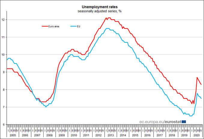როგორც „ევრონიუსი“ იუწყება, ევროზონაში უმუშევრობის დონე ნოემბერის თვეში 8,3%-მდე შემცირდა, თუმცა საერთო მაჩვენებელმა 2020 წელს, წინა წლების სტატისტიკა გადაფარა.