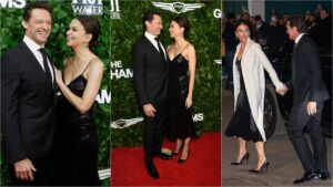 50 წლის სატონს ბრჭყვიალა შავი კაბა ამშვენებდა, 57 წლის ჰიუ კი კლასიკურ კოსტიუმში იყო გამოწყობილი