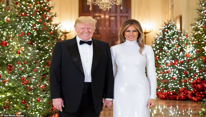 დონალდ და მელანია ტრამპების საშობაო ფოტო 18 დეკემბერი, 2018 თეთრ სახლში საშობაოდ მორთულ Cross Hall-შია გადაღებულ ფოტოში დონალდი და მელანია ხელჩაკიდებულები არიან