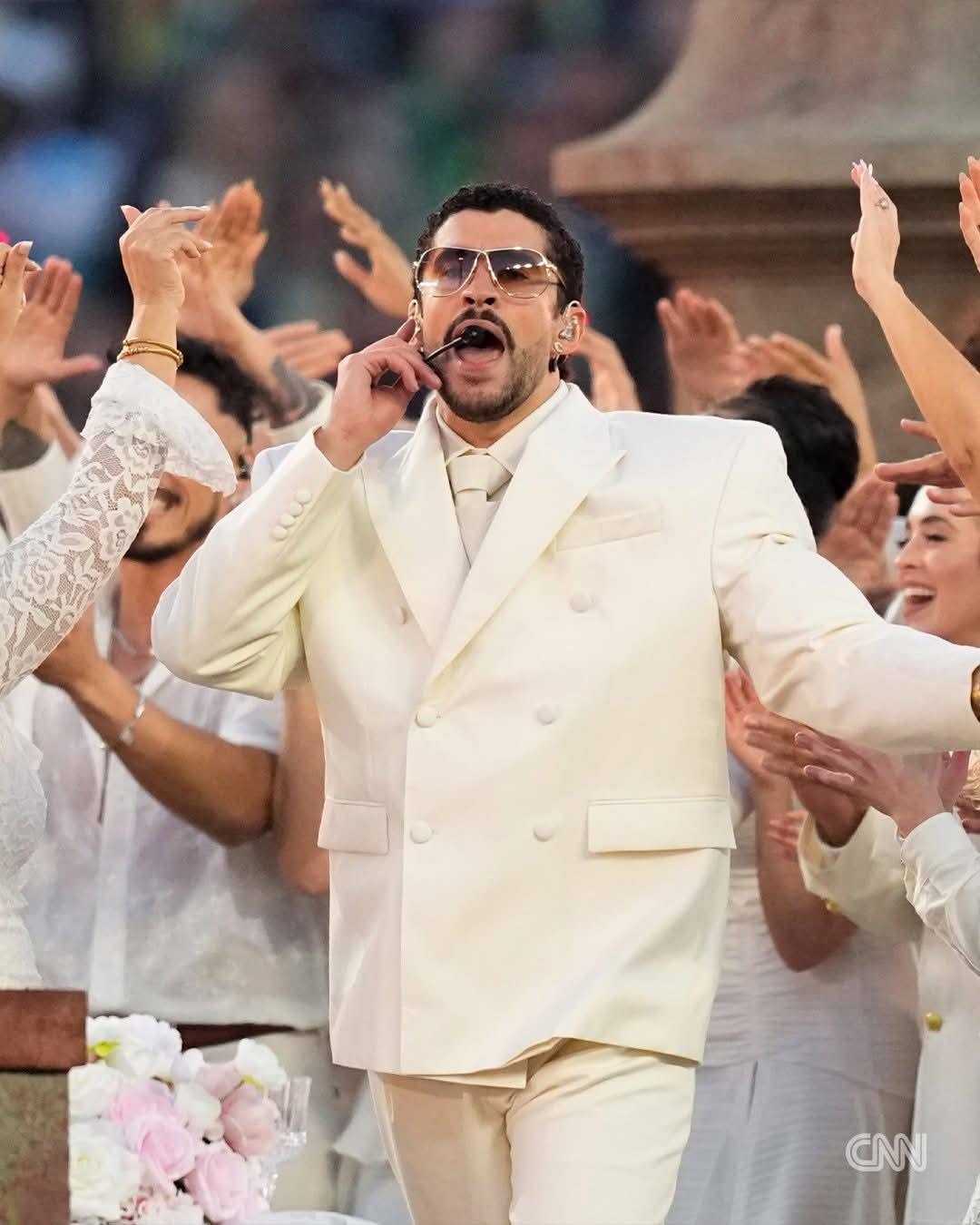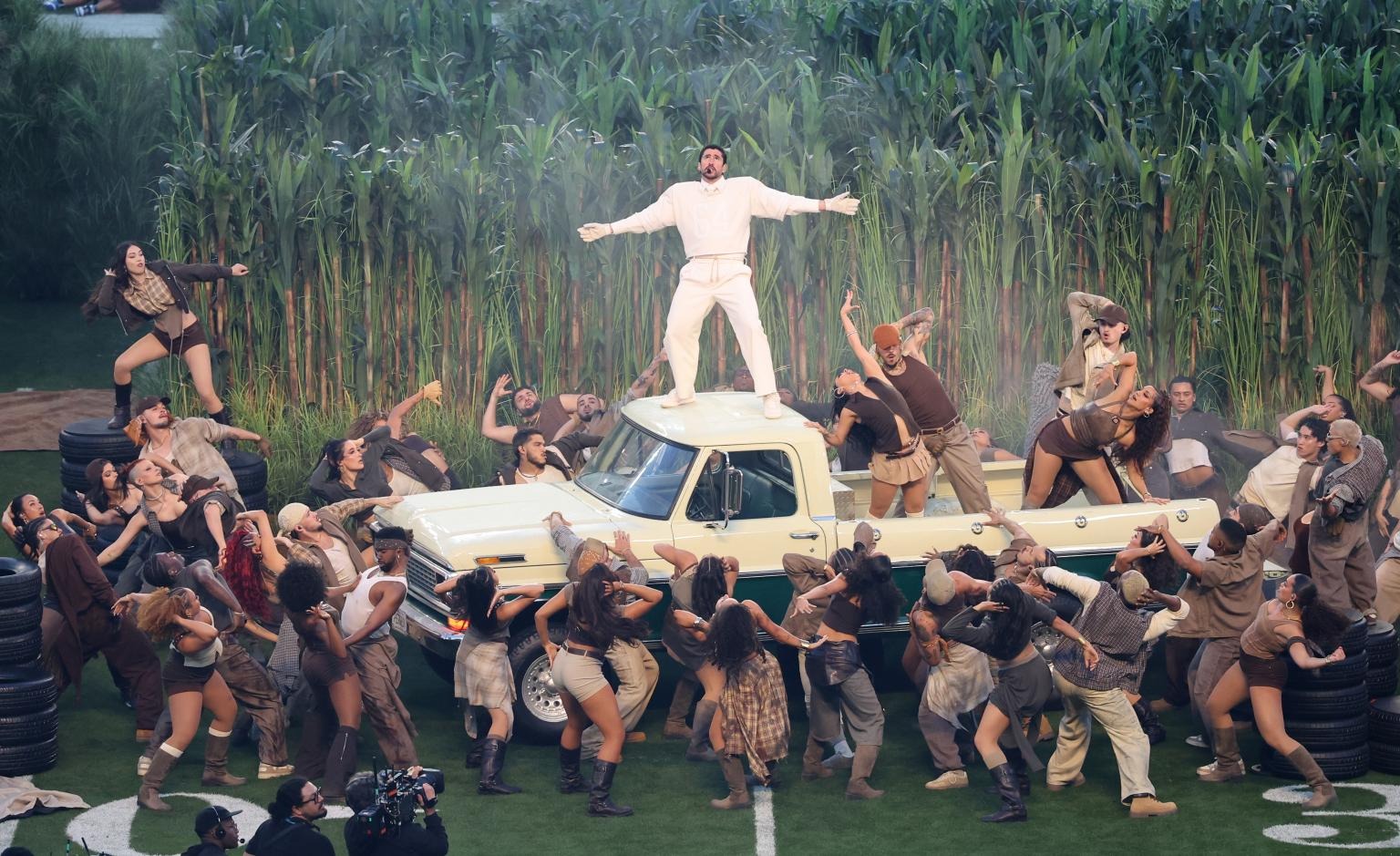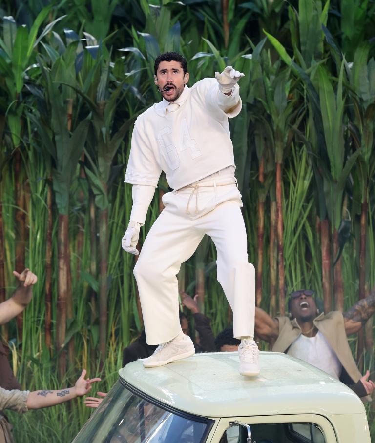 Bad Bunny-ის გამოსვლა სავსე გახლდათ მისი სამშობლოს, პუერტო-რიკოს კულტურული სიმბოლოებით. სცენაზე წარმოდგენილი იყო მწვანე ლანდშაფტი, ფერმის მუშები, ხოლო ერთ-ერთ მომენტში არტისტი რეალური ქორწილის ეპიცენტრშიც აღმოჩნდა.