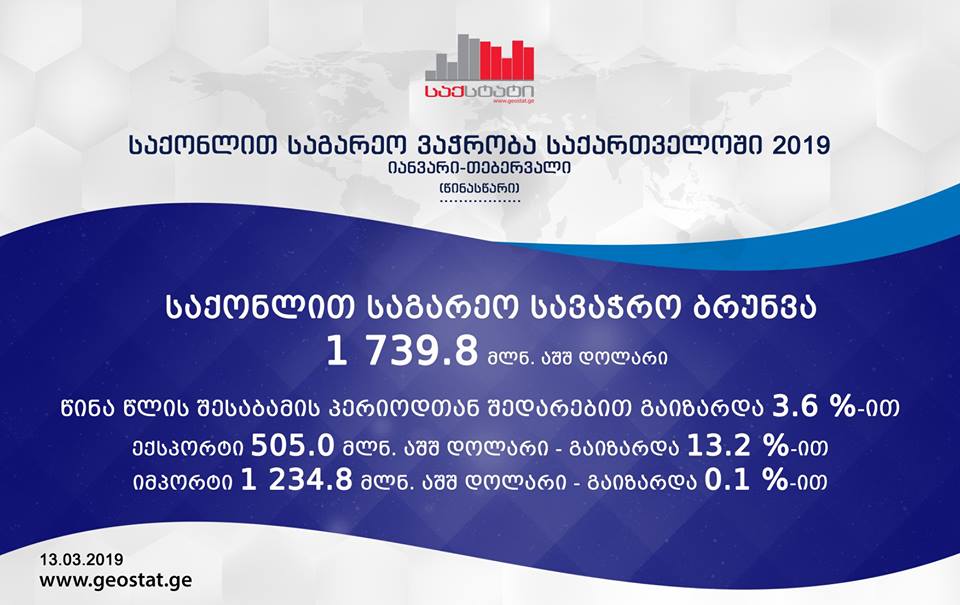 საქართველოს სტატისტიკის ეროვნული სამსახურის წინასწარი მონაცემებით, 2019 წლის იანვარ-თებერვალში საქართველოში საქონლით საგარეო სავაჭრო ბრუნვამ (არადეკლარირებული ვაჭრობის გარეშე) 1 739.8 მლნ. აშშ დოლარი შეადგინა, რაც წინა წლის შესაბამისი პერიოდის მაჩვენებელზე 3.6 %-ით მეტია. აქედან, ექსპორტი 505.0 მლნ. აშშ დოლარი იყო (13.2 %-ით მეტი), ხოლო იმპორტი 1 234.8 მლნ. აშშ დოლარი (0.1%-ით მეტი).