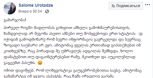 სალომე უროტაძე მის მიმართ გაჩენილ შეკითხვებს საკუთარ ფეისბუქ გვერდზე პასუხობს.
