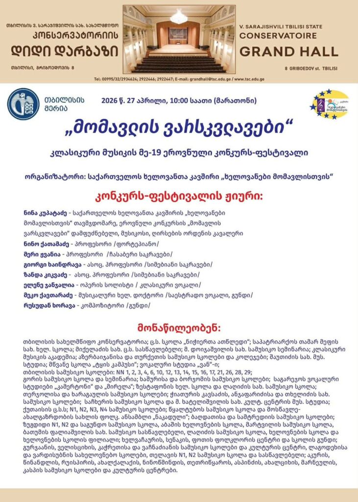 27 აპრილს, სახელმწიფო კონსერვატორიის დიდ საკონცერტო დარბაზში, თბილისის მერიის მხარდაჭერით გაიმართა კლასიკური მუსიკის მე-19 ეროვნული კონკურსის „მომავლის ვარსკვლავები” საზეიმო დასკვნითი გალაკონცერტი და დაჯილდოების ცერემონია.