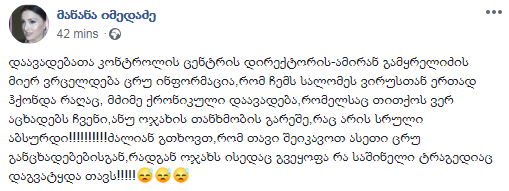 „დაავადებათა კონტროლის ცენტრის დირექტორის – ამირან გამყრელიძის მიერ ვრცელდება ცრუ ინფორმაცია,რომ ჩემს სალომეს ვირუსთან ერთად ჰქონდა რაღაც, მძიმე ქრონიკული დაავადება,რომელსაც თითქოს ვერ აცხადებს ჩვენი,ანუ ოჯახის თანხმობის გარეშე,რაც არის სრული აბსურდი!!!!!!!!!! ძალიან გთხოვთ, რომ თავი შეიკავოთ ასეთი ცრუ განცხადებებისგან, რადგან ოჯახს ისედაც გვეყოფა რა საშინელი ტრაგედიაც დაგვატყდა თავს!!!!!“
