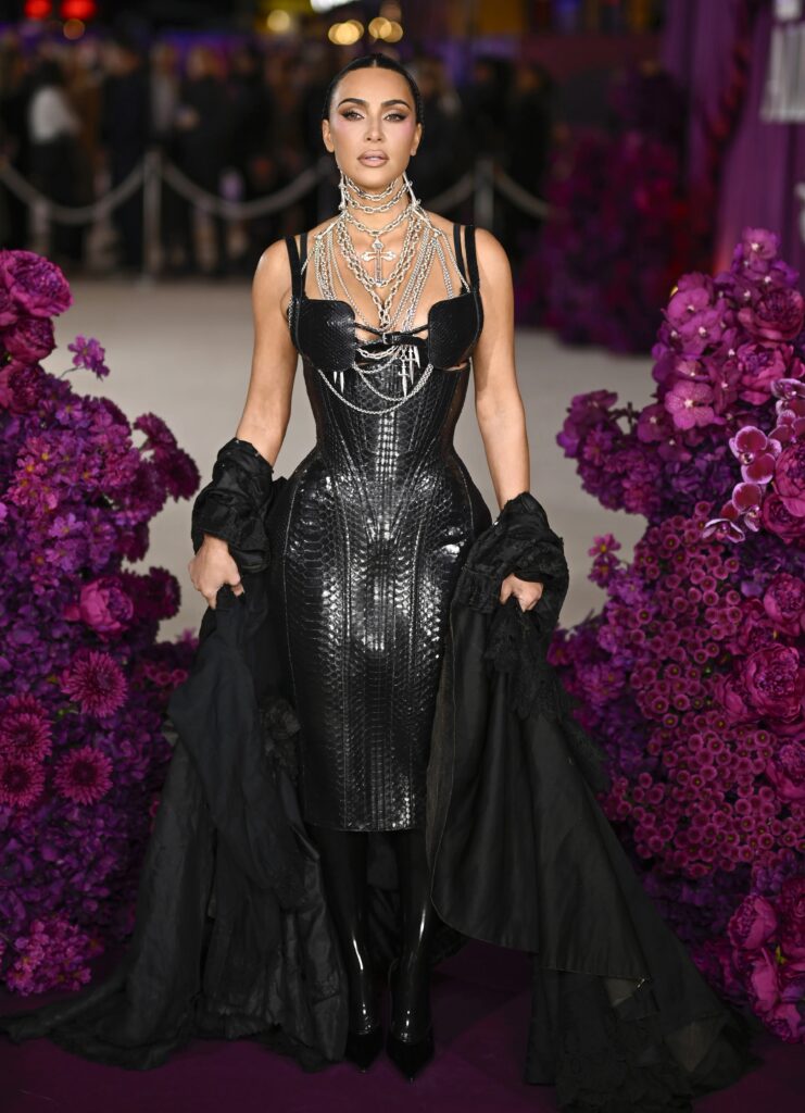 კიმი, როგორც ყოველთვის, ყურადღების ცენტრში მოექცა. ის წითელ ხალიჩაზე გამოვიდა შთამბეჭდავ ტყავის კორსეტიან კაბაში, რომელსაც ვერცხლისფერი აქსესუარები ამშვენებდა.