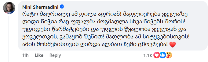 „რატო მაღრიალე ამ დილა ადრიან! მადლიერება ყველაზე დიდი ნიჭია რაც უფალმა მოგმადლა სხვა ნიჭებს შორის! უდიდესი წარმატებები და უფლის წყალობა ყველგან და ყოველთვის, ვამაყობ შენით! მადლობა ამ სიტყვებისთვის! ამის მოსმენისთვის ღირდა ალბათ ჩემი ცხოვრება!“, – წერს ნინი შერმადინი.
