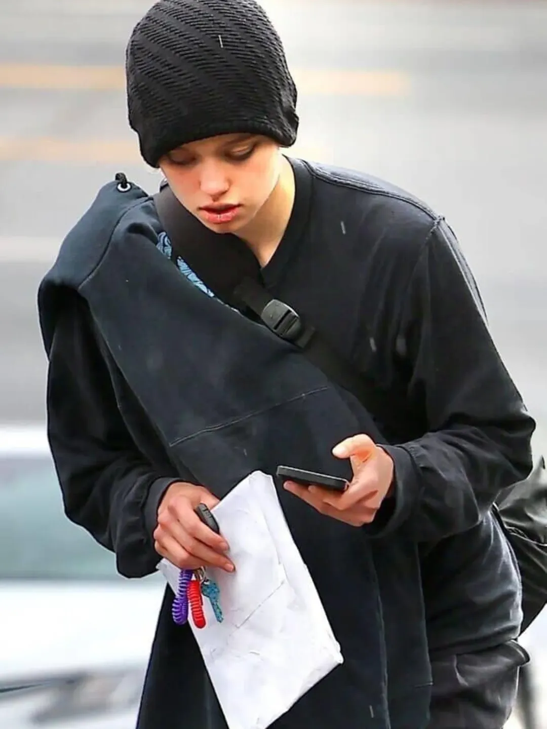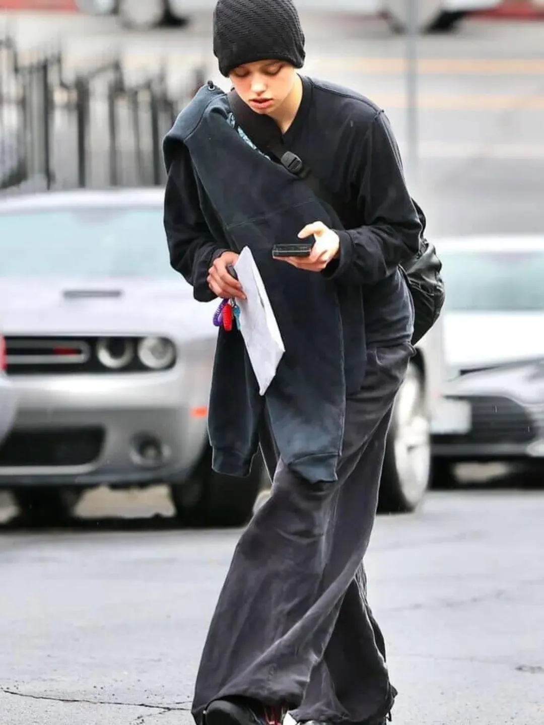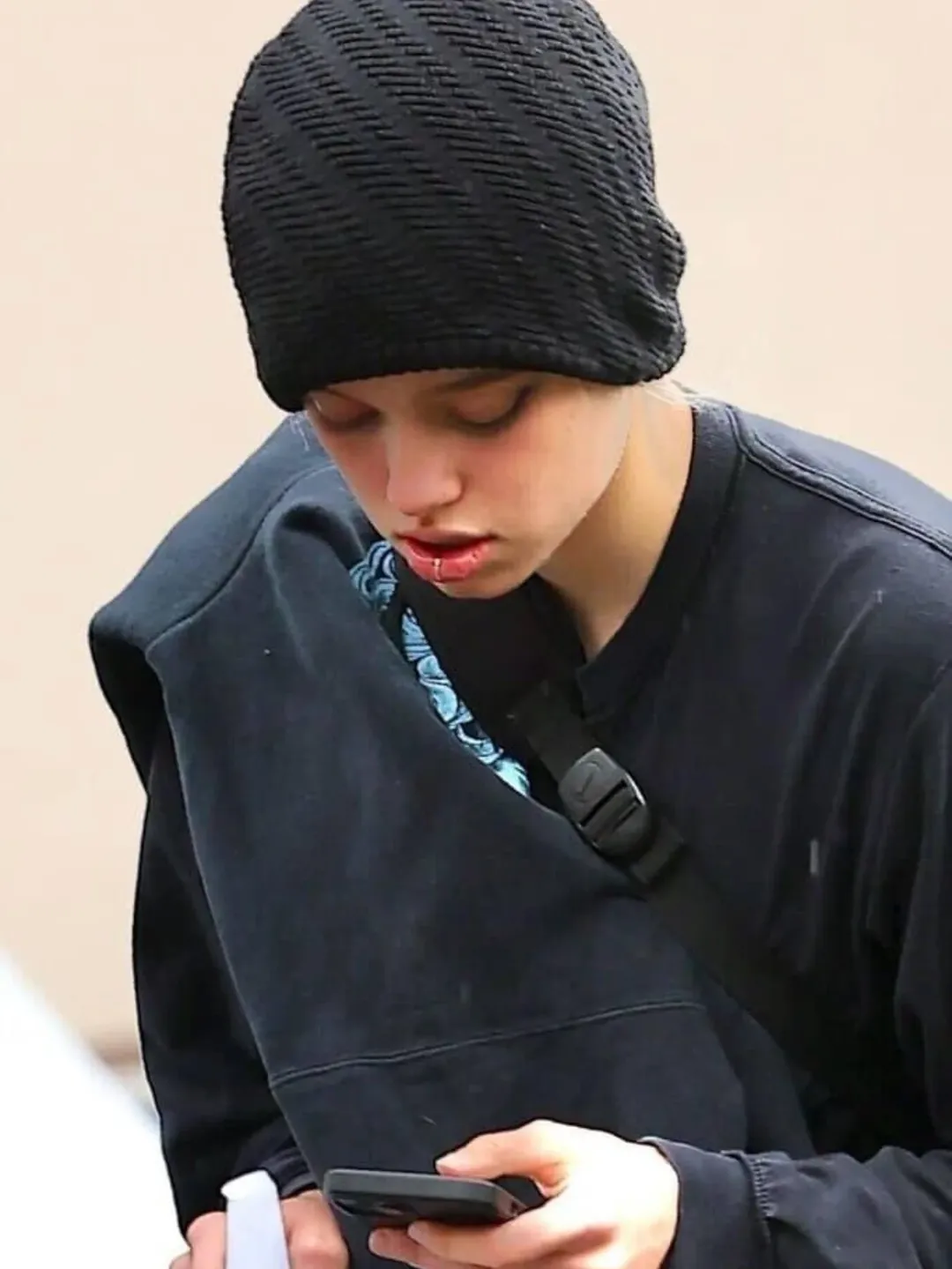 გოგონას, როგორც ყოველთვის თავისუფალი სტილის სამოსი ეცვა და ცოტა არ იყოს მოწყენილი ჩანდა. რაც შეეხება ნოქსს, მან იმიჯი რადიკალურად შეიცვალა. წყვილის ერთადერთი ბიოლოგიური ვაჟი ვარდისფერი თმით და შორტით გადაიღეს.