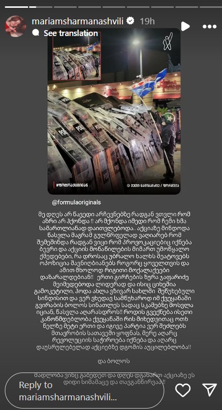 „მე დღეს არ წავედი არჩევნებზე, რადგან ვთვლი, რომ აზრი არ ჰქონდა!! არ მქონდა იმედი, რომ ჩემი ხმა სამართლიანად დაითვლებოდა. აქციებზე მინდოდა წასვლა, მაგრამ გულწრფელად ვაღიარებ, რომ შემეშინდა, რადგან ვიცი, რომ პროვოკაციებიც იქნება და აქციის მონაწილეების უმოწყალო ქმედებები, რა დროსაც უბრალო ხალხს შეატოვებს ოპოზიცია შავნიღბიანებს, როგორც ყოველთვის და ამით მხოლოდ რიგითი მოქალაქეები დაზარალდებიან. ერთი გირჩების ზურა ჯაფარიძე მეიმედებოდა ლიდერად და ისიც ციხეშია გამოკეტილი. ჰოდა, ახლა ვზივარ სახლში შეწუხებული სინდისით, და ვერ ვხედავ სამწუხაროდ იმ ქვეყანაში გვირაბის ბოლოს სინათლეს, სადაც სკამებზე მოსვლა იციან, წასვლა – აღარასდროს! როდის გვექნება ისეთი კანონმდებლობა ქვეყანაში, რის მიხედვითაც ოთხ წელზე მეტი ერთი და იგივე პარტია ვერ შეძლებს მთავრობის სათავეში ყოფნას. მერე აღარც რევოლუციის საჭიროება იქნება და აღარც დაუსრულებლად აქციებზე დგომის აუცილებლობა!”,- წერს მარიამ შარმანაშვილი.