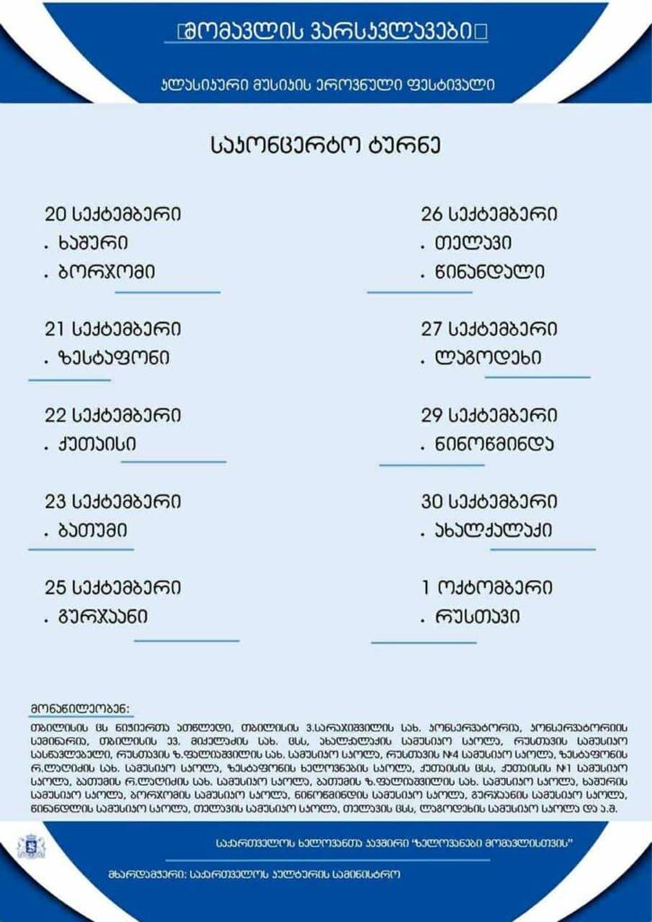 საქართველოს ხელოვანთა კავშირმა „ხელოვანები მომავლისთვის”, კულტურის სამინისტროს ხელშეწყობითა და მხარდაჭერით, 20 სექტემბრიდან 2 ოქტომბრამდე საქართველოს სხვადასხვა რეგიონში კლასიკური მუსიკის ეროვნული ფესტივალის „მომავლის ვარსკვლავების” საკონცერტო ტურნე გამართა, მასტერკლასების, ღია გაკვეთილებისა და მეთოდური ლექციების თანხლებით, სადაც მონაწილეობდნენ „მომავლის ვარსკვლავების” პრიზიორები და ლაურეატები.
