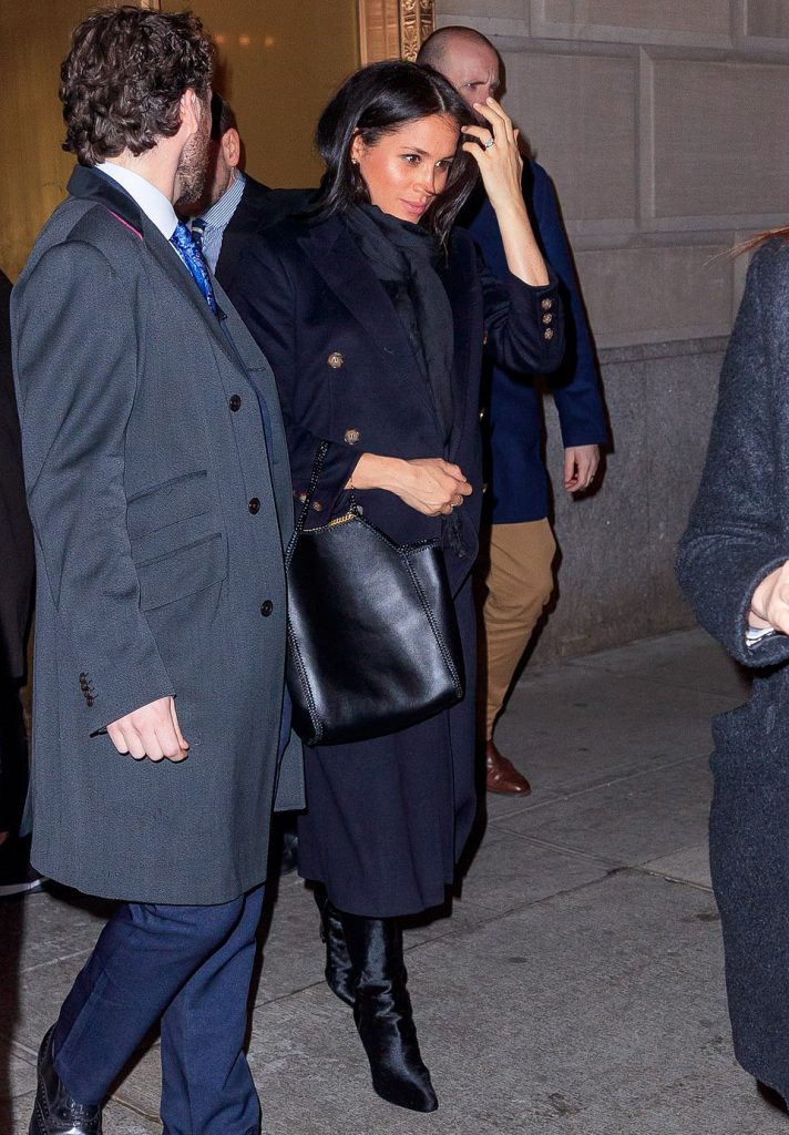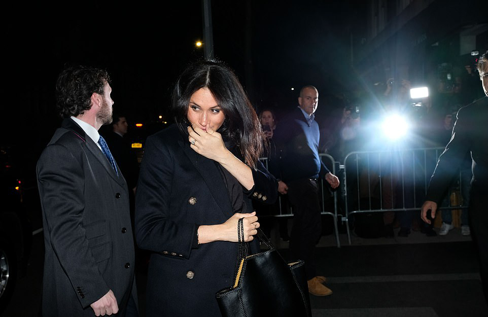 მეგანი წვეულებაზე პირველი გამოჩნდა, ის რესტორანში დაცვის თანხლებით შევიდა. ამჯერად სასექსის ჰერცოგინიამ არჩევანი ვიქტორია ბექჰემის შავი ფერის პალტოზე გაკეთა.