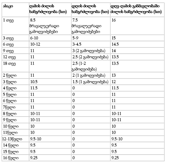 ასაკის მიხედვით დღე -ღამის განმავლობაში ძილის ხანგრძლივობა: