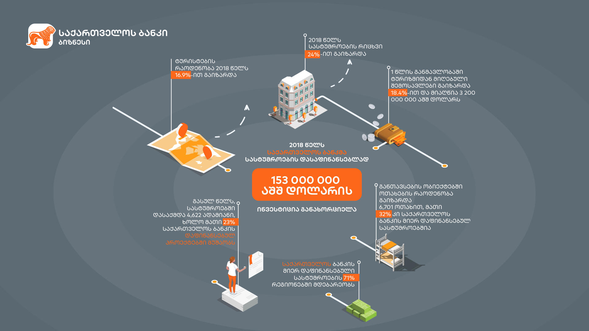 „2018 წელს „საქართველოს ბანკმა“ სასტუმროების დასაფინანსებლად ჯამში 153 მილიონი დოლარის ინვესტიცია განახორციელა. ბანკმა მცირე და საშუალო ბიზნესის რეგიონებში წახალისების მიზნით არაერთი პროექტი განახორციელა. სწორედ ამიტომ, „საქართველოს ბანკის“ მიერ დაფინანსებული სასტუმროების 71% რეგიონებში მდებარეობს და ხელს უწყობს ადგილობრივი ეკონომიკისა და ტურიზმის განვითარებას. „საქართველოს ბანკის“ მხარდაჭერით გასულ წელს, სასტუმროებში დასაქმდა 4,622 ადამიანი, აქედან 23% „საქართველოს ბანკის“ მიერ დაფინანსებულ პროექტებში. 2018 წლის მანძილზე ოთახების რაოდენობა განთავსების ობიექტებში გაიზარდა 6,701 ოთახით, მათი 32% კი „საქართველოს“ ბანკის მიერ დაფინანსებულ სასტუმროებს წარმოადგენს.“ – ნათქვამია ინფორმაციაში.