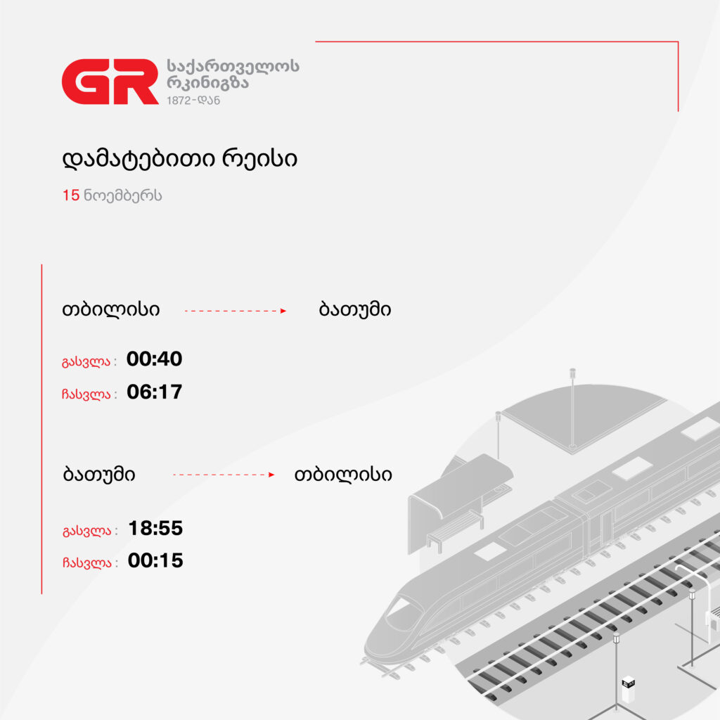საქართველოს რკინიგზა, მგზავრების თხოვნის გათვალისწინებით, რაგბის თამაშზე დასწრების მსურველთათვის, 15 ნოემბერს, თბილისი-ბათუმი-თბილისის მიმართულებით შტადლერის ტიპის მატარებლის რეისს ამატებს.
