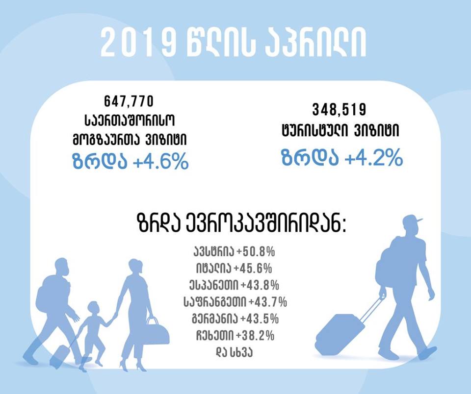 2019 წლის აპრილში საქართველოში 647,770 საერთაშორისო მოგზაურთა ვიზიტი შედგა, ზრდა +4.6%. ტურისტული ვიზიტების რაოდენობამ 348,519 შეადგინა, რაც 14,018-ით მეტია 2018 წლის აპრილის მაჩვენებელზე. (ზრდა +4.2%)