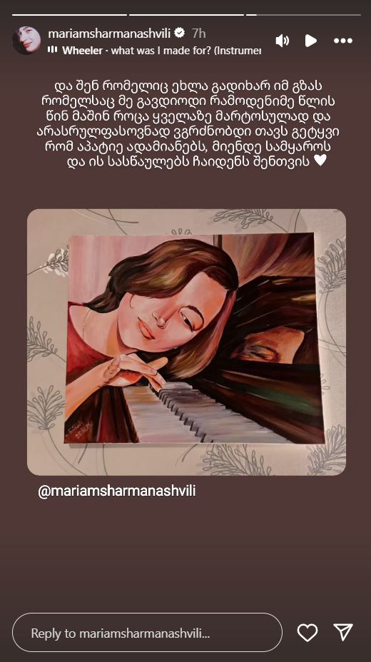 „და შენ, რომელიც ახლა გადიხარ იმ გზას, რომელსაც მე გავდიოდი რამდენიმე წლის წინ… მაშინ, როცა ყველაზე მარტოსულად და არასრულფასოვნად ვგრძნობდი თავს… გეტყვი, რომ აპატიე ადამიანებს, მიენდე სამყაროს და ის სასწაულებს ჩაიდენს შენთვის“, – წერს მარიამ შარმანაშვილი.