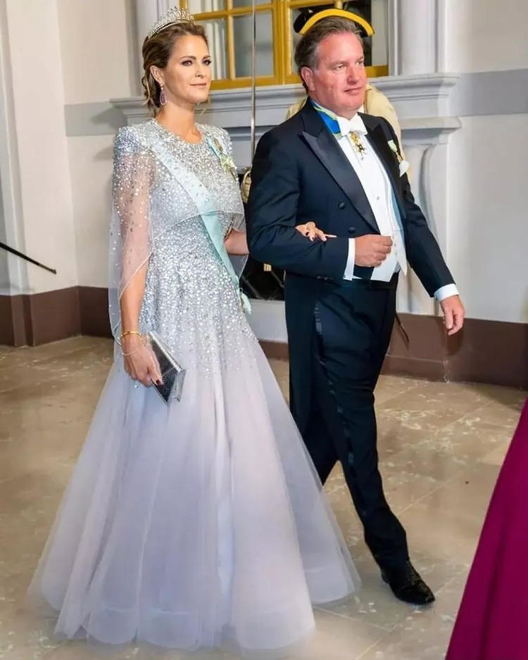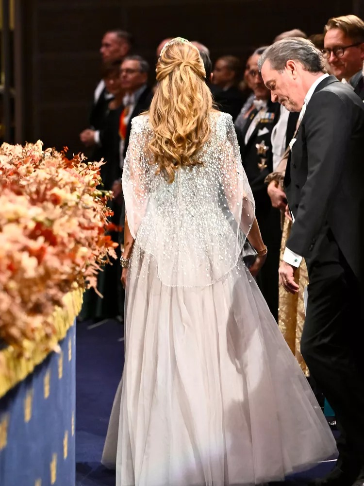 ბრიტანელი დიზაინერის ერთგული თაყვანისმცემელი პრინცესა გალაზე იმავე კაბით გამოჩნდა, რომელიც 2023 წელს, მეფე კარლ გუსტავის ოქროს იუბილეზე ეცვა. კაბა გამოირჩეოდა მსუბუქი, ჰაეროვანი სილუეტის ტიულის ქვედაბოლოთი, რომელიც თანდათან გადადიოდა მჭიდროდ მორგებულ, მძივებით მდიდრულად გაფორმებულ ბოდეში. ანსამბლს სრულყოფილ ელფერს სძენდა მხრებზე გადაფენილი გამჭვირვალე, ნაქარგი ზედა ფენა. პრინცესამ ლუქი ისტორიული „აქვამარინის” დიადემითა და შესაბამისი საყურეებით დაასრულა.