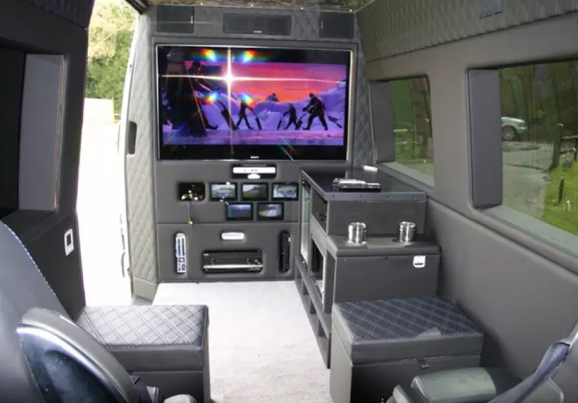 ფურგონის შიგნით 55 დიუმიანი პლაზმური ეკრანია დამონტაჟებული და მასზე თამაში ნებისმიერი გაჯეტითაა შესაძლებელი.