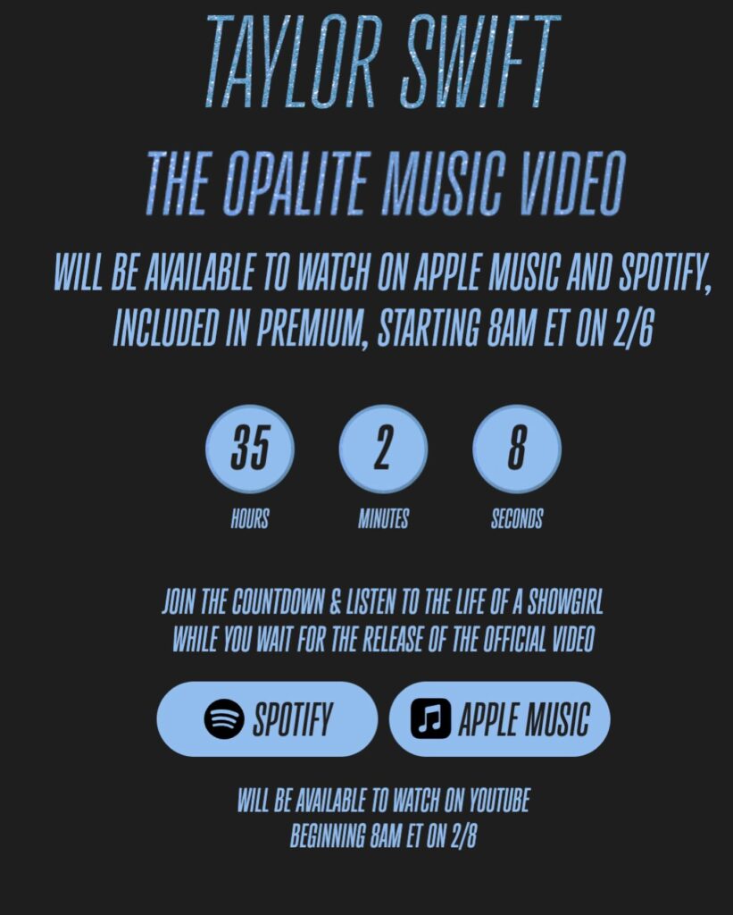 ტეილორ სვიფტი სიმღერის – Opalite კლიპს გამოუშვებს. არტისტის ინფორმაციით, ვიდეოს პრემიერა 6 თებერვალს, YouTube-ის ნაცვლად, Spotify-სა და Apple Music-ზე შედგება. მუსიკალური რგოლი ,,იუთუბზე”, 8 თებერვალს გამოჩნდება.