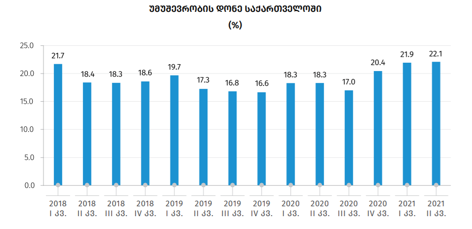 საქსტატის ინფორმაციით, 2021 წლის მე-2 კვარტალში საქართველოში უმუშევრობის დონე წინა წლის შესაბამის პერიოდთან შედარებით 3.8 პროცენტით გაიზარდა და 22.1 პროცენტი შეადგინა.