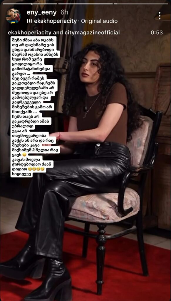შენი ძმაა, აბა, ოჯახს თუ არ დაეხმარე, ვის უნდა დახმარებოდი. მაგრამ ოჯახის ამბებს, სულ რომ ეგრე ყოფილიყო, რა გამომატანინებდა გარეთ. მეც ბევრ რამეს ვაკეთებდი, რაც ჩემს ვალდებულებაში არ შედიოდა და ასე არ გამოვსულვარ და გაურკვეველი მიზეზების გამო არ მითქვამს. ჩემს თავს არ ვაკადრებდი ამას. უბრალოდ ეგაა, თავმოყვარეობა გაქვს, ან – არა. და რაც შეეხება კატას, მაქსიმუმ ორი წელია, რაც ჰყავს. კატას მოვლა სჭირდებოდა ძალიან დიდიო, სიგიჟეა…”
