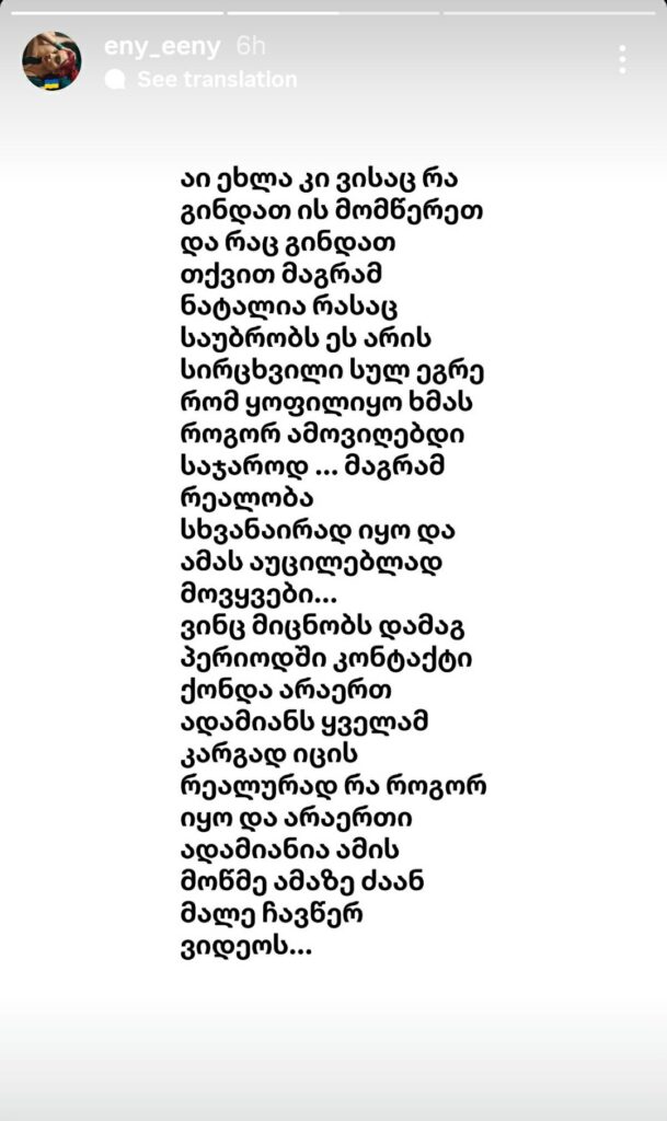 „აი, ახლა კი ვისაც რა გინდათ ის მომწერეთ, რაც გინდათ თქვით, მაგრამ ნატალია რასაც საუბრობს, ეს არის სირცხვილი. სულ რომ ეგრე ყოფილიყო, ხმას როგორ ამოვიღებდი საჯაროდ. მაგრამ რეალობა სხვანაირად იყო და ამას აუცილებლად მოვყვები. ვინც მიცნობს და მაგ პერიოდში კონტაქტი ჰქონდა, არაერთ ადამიანს, ყველამ კარგად იცის რეალურად რა და როგორ იყო, ამაზე ძალიან მალე ჩავწერ ვიდეოს.